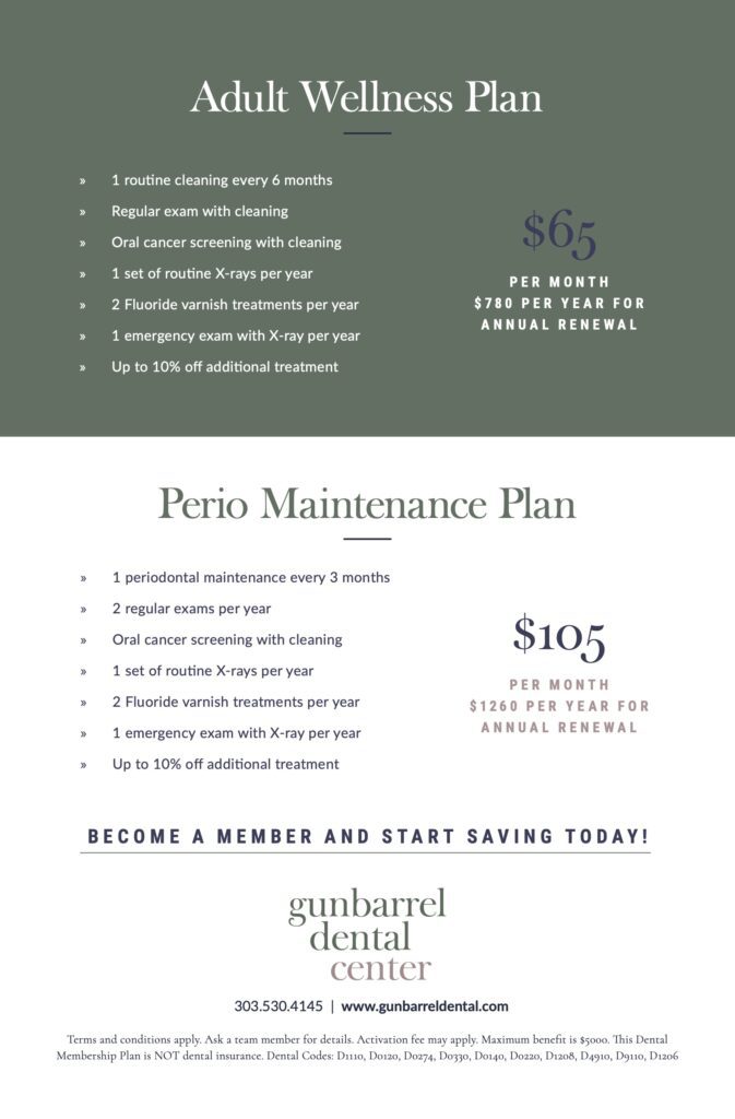 At Gunbarrel Dental Center, we want our patients to access high-quality dental care at an affordable price. Even if you don’t have dental benefits, we’ve got you covered. Join our membership and get the preventative care you need without the hassles of dental insurance. Contact our office at 303-530-4145 to sign up for our membership plan.